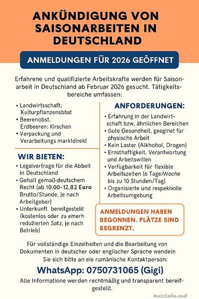Se caută personal calificat și cu experiență pentru muncă sezonieră în Germania,  si pentru cine este interesat ajut la depunerea documentelor in vederea inregistrarii si inceperii de munca in agricultura  începând cu luna februarie 2026. Domeniile de activitate includ: